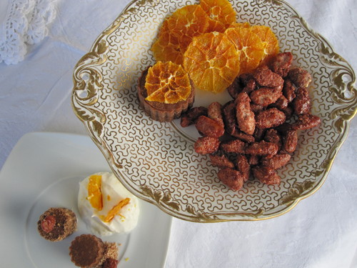 5 Disponha no prato como quiser, mas não se esqueça das rodelas de laranja e de juntar umas amêndoas inteiras.