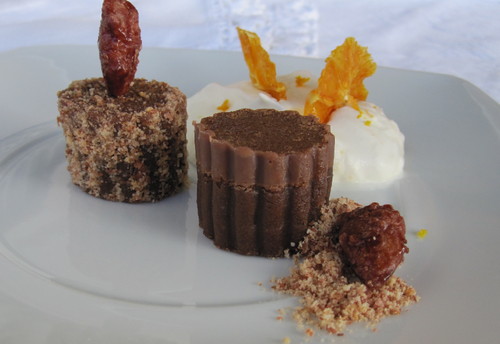 Hoje começam as Cenas: na terceira sexta-feira do mês proponho-vos transformar um produto vulgaríssimo e fácil de adquirir num prato de gabarito, digno de qualquer mesa, e tudo isto em menos de nada. Mas já vão perceber como isto funciona com esta primeira cena. Peço desculpa, mas chama-se mesmo Kaka de nome próprio e CHOKLADTRYFFEL de apelido. É um bolo de chocolate que se compra congelado no Ikea e que se pode ter sempre à mão (3,99 euros). A receita completa-se com menos de uma mão-cheia de ingredientes. O resultado final obtém-se em 5 minutos (ou menos para mãos mais treinadas…) e consiste numa óptima e bonita sobremesa que conjuga dois sabores clássicos: chocolate e laranja.