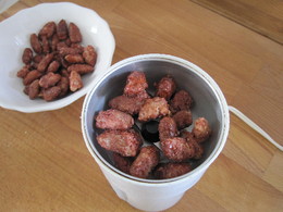 1 Triture as amêndoas caramelizadas (usei o moinho de café).