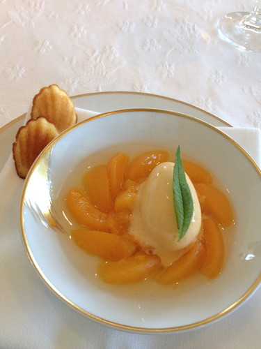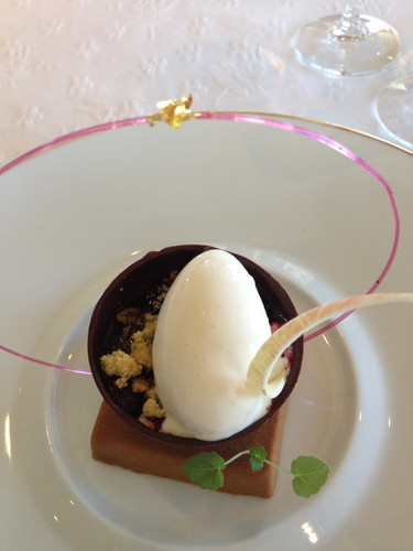 Seguidamente, limpámos a boca com uma Nage de alperces em lúcia-lima fresca, pequenas madalenas e sorbet de iogurte e deliciámo-nos com Cerejas com kirsch, biscoito e cremoso de pistácio e gelado de kirsch velho da Alsácia. Inácio Loureiro presenteou-nos com o Niepoort Vintage 1997. [Desde 1842 que a família Niepoort produz vinhos do Porto, possuindo a melhor e mais diversificada matéria-prima, que obtêm através de antigos contratos com pequenos produtores a quem acompanham e tratam das vinhas: são mais de 700 parcelas de vinha, principalmente no Cima Corgo. No nariz, este vinho apresenta cerejas e amoras maduras (mas frescas) com madeira tostada. Na boca perdura até à eternidade, com tudo o que tivemos direito nos aromas, mas com sabores a uvas em passa, cerejas e anis, envoltos em veludo e taninos doces.]