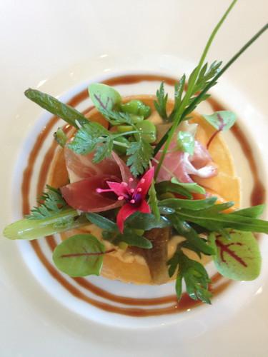 Começámos com uma hortinha trazida da Quinta do Poial com creme de foie gras fumado e lascas de culatello di Zibello. Com séculos de existência na região de Parma, o culatello é um presunto feito apenas de um músculo, uma espécie de lombinho da perna, ensacado em bexiga de porco e enguitado como o nosso lombo de Portalegre. A sua fama de ser o topo dos presuntos resulta também do clima da região, muito dado a névoas que criam uma humidade permanente. O fumado do foie gras trouxe a esta entrada o sabor característico a que estamos habituados no presunto.