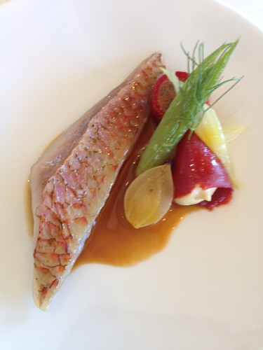 De seguida, nova entrada: Filete de salmonete assado com óleo de limão, legumes glaceados com cominhos e açafrão, molho avinagrado. [Servidas com o Billecart-Salmon Brut Reserve, um champagne harmonioso e equilibrado. O seu lote permanece inalterado desde 1945: uvas de três anos diferentes - Pinnot Noir, Chardonnay e Pinot Meunier - das melhores vinhas da Vallée de la Marne. Este cuvée destaca-se pela finura das suas bolhas. O aroma é maduro com frescura floral e notas de gengibre. Um ataque cheio no palato seguido por uma frescura perfeita e um bouquet rico.]