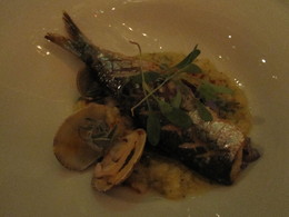 Grande defensor dos produtos portugueses, não tivesse ele sido sub-chefe de Aimé Barroyer no Pestana o Henrique não podia deixar passar em claro o S. Pedro e o jantar teve apontamentos engraçados de festa popular. A sardinha não podia faltar nos santos e lá veio ela, não deitada na sua caminha de pão, mas numa deliciosa almofada de xerém de bivalves. Será que esta combinação da sardinha sobre o pão tem ainda origem no costume medieval de servir a carne sobre várias fatias de pão duro (os tranchoirs), numa época em que não se usavam os pratos individuais? Só que, em vez de se deitar o pão aos cães como se fazia nos banquetes, não há melhor que comê-lo já bem enriquecido com os sucos da sardinha.