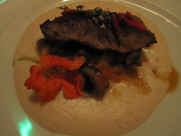 A celebrar a bifana, o prato de carne era uma das melhores peças do porco, a que os espanhóis chamam pluma. Pouco gorda, situa-se na ponta do lombo. Vinha com outro petisco típico desta época, os caracóis, envolvidos em namoro com um saboroso feijãozinho. A fechar a refeição a leve acidez do alperce surgiu sob várias vestes (gelado, leite-creme e desidratado), numa sobremesa adequada a contrariar os eventuais efeitos das iguarias populares.