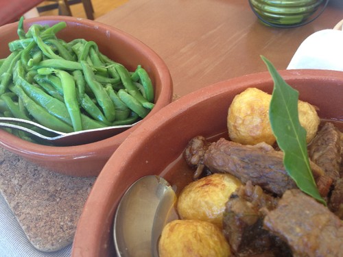 Para acompanhar, saborosíssimo pão de centeio feito no forno de lenha da casa, de onde também saiu o belíssimo tachinho de vaca estufada. Para acompanhar, batatinha com casca e feijão verde da horta do dono. O feijão verde era um caso sério, daquele amanteigado, sem um fio, muito bem cortado em tirinhas compridas e finas e sem nada (sem aqueles tais alhos) que lhe disfarçasse o sabor a...feijão verde. Se não houvesse mais nada no restaurante, ainda assim valia a pena lá ir só para o comer.