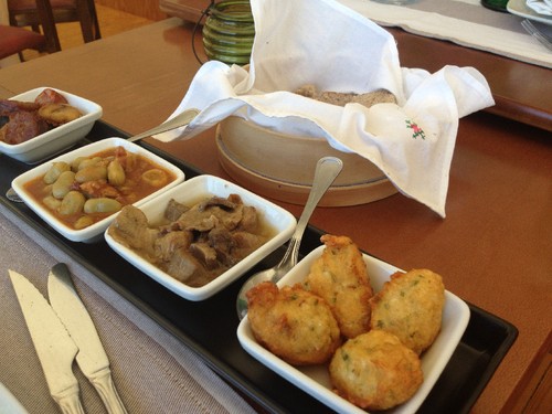 As favinhas estavam normais, os enchidos um pouco secos. As pataniscas ricas em bacalhau com boa altura e textura, mas um pouco saborosas a alho. Era bom que os cozinheiros percebessem que o alho é muito mediterrânico e faz bem à saúde, sim senhor, mas não pode abafar os outros sabores. Até na praia de Monte Gordo me serviram peixe grelhado carregado de alho picado, traiçoeiramente escondido debaixo dos opérculos do dito.