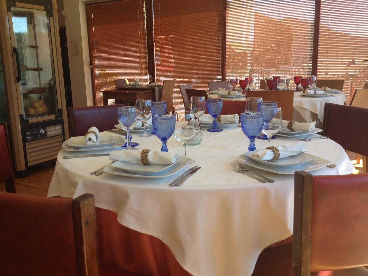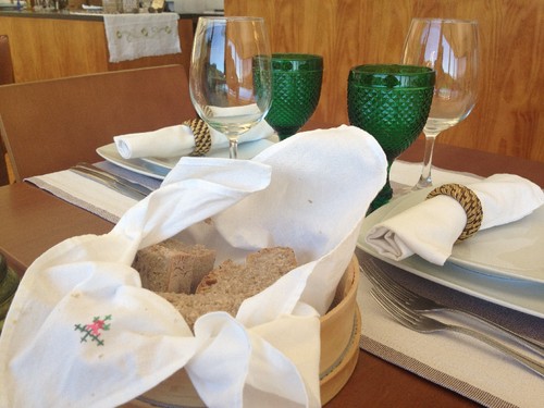 O restaurante Varanda do Casal está alojado numa casa de traça moderna com grandes vidraças, contrastando com a rusticidade da aldeia, e de onde se avistam as encostas pintadas com o verde de pinheiros e eucaliptos. No andar térreo, há uma pequena loja de produtos locais. Quando subi ao primeiro andar, confesso que não estava à espera de encontrar mesas tão bem postas e uma sala tão bem decorada. As mesas redondas com toalhas alvas alternam com as quadradas de chemins às riscas cinzentas, mas o que lhes dá a vida são os copos de pé alto, todos de cores garridas e diferentes.