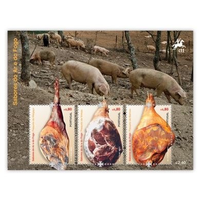 Já saíram os selos da primeira emissão Sabores do Ar e do Fogo, com as respectivas pagelas. As magnificas fotos são do Mário Cerdeira, o texto das pagelas é do José Quitério e meu. Ligado a este tema, sairá em Maio, lançado no Congresso Mundial do Presunto, em Ourique, o livro com o mesmo nome da minha autoria e com fotos do Mário. Estou felicíssima.