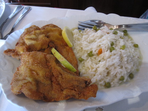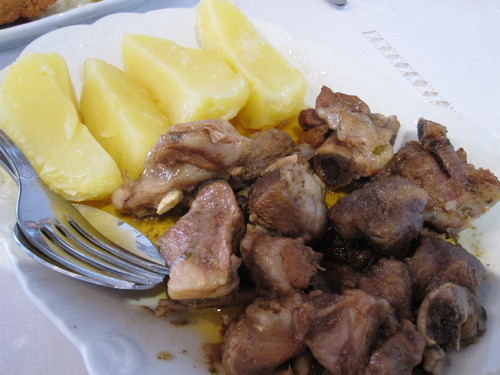 Depois, dois pratos de borrego (se fosse num desses restaurantes a pingar ao moderno talvez propusessem na linguagem rebuscada das ementas um "dueto" de borrego ou "borrego em duas declinacões"). Ora eles eram mas é costeletas panadas com arroz de ervilhas e cenoura e um guisado.