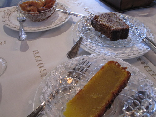 Sobremesas: ambas de ovos (caseiros), açúcar e amêndoa. É inacreditável como com estes três ingredientes se pode fazer uma variedade tão grande de doces. A nossa imaginação não tem limites. A primeira chama-se Mimo e é mimosa. Imaginem um toucinho-do-céu sem abóbora-gila e estão muito perto. Delicioso. O segundo, coisa mais rústica, um bolo de tabuleiro com a amêndoa com pele grosseiramente picada, de textura muito agradável. Outras opções do dia: leite-creme, farófias, pão-de-ló de Alpiarça. Uma taça de gamboas assadas no forno em quartos e com calda foi irrecusável. A época dos marmelos começou agora.