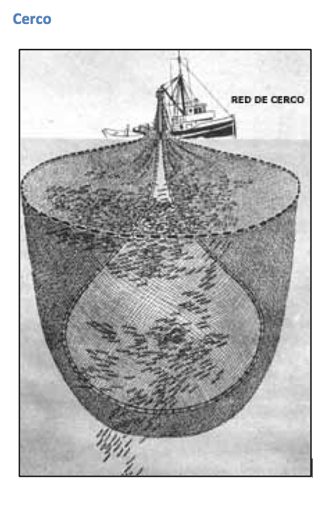 Na pesca ao cerco, a embarcação pequena, que foi trazida a reboque da traineira, coloca-se num ponto fixo, enquanto a traineira anda em redor dele e lança as redes, fechando o cerco e envolvendo o peixe pelos lados e por baixo, como um saco. Com algumas excepções, são redes de superfície, cuja linha de flutuação possui numerosas bóias em plástico.