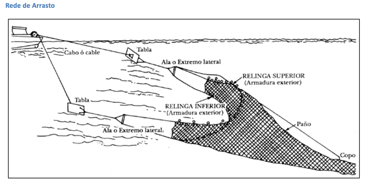 No arrasto, a pesca é feita através de redes em forma de cone fechado em baixo e prolongado por asas até à boca. Podem ser rebocadas por uma ou duas embarcações e, de acordo com o respectivo tipo, podem funcionar no fundo ou entre duas águas (pelágicas).