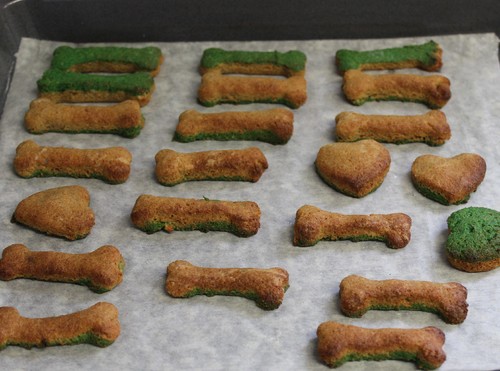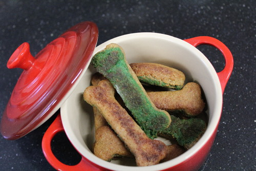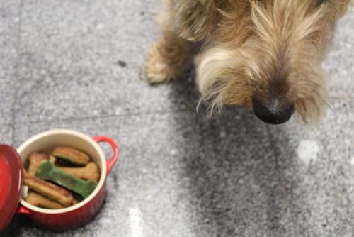 A receita destes biscoitos fui buscá-la ao livro Cão Gourmet de Myrian Abicair, editada no Brasil pela Cook Lovers, e adaptei-a.