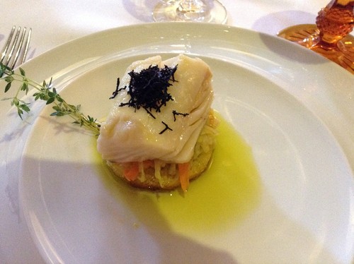 Caviar português: ovas de sardinha, caviares de vinagre, tomate, broa de milho, ervas finas e espuma de azeite. Aqui se encontra tudo o que pertence a uma boa sardinhada. Destaco a saborosa esferificação dos caviares de vinagre. O prato tem alguma encenação (vem numa lata de sardinhas com etiqueta descritiva apensa), que não tem eco no resto da refeição.