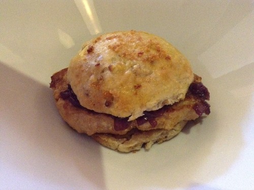 "Bifana" de bísaro com compota de cebola roxa. Combinação deliciosa da cebola-roxa com o porco e um belíssimo pão redondo. É sempre bom comer à mão. Aqui está um enriquecimento precioso da tradição.