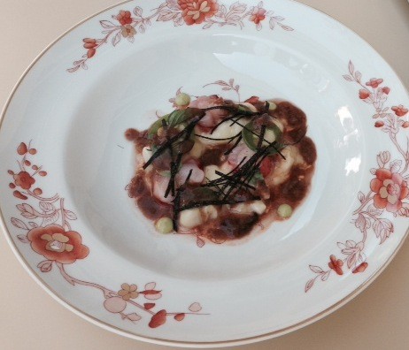 Muñoz aproveitou para colocar no seu prato as tais tendências actuais: o uso dos cítricos (por exemplo, o yuzu e a combava ou lima-kaffir), dos picantes (jalapeño) e das ervas (manjericão-tailandês) como forma de temperar, substituindo parte do sal. Juntou ainda ao bacalhau “o melhor molho mediterrâneo”: o interior da cabeça de um carabineiro. Para ele num prato todos os ingredientes “têm de tocar a mesma partitura”.