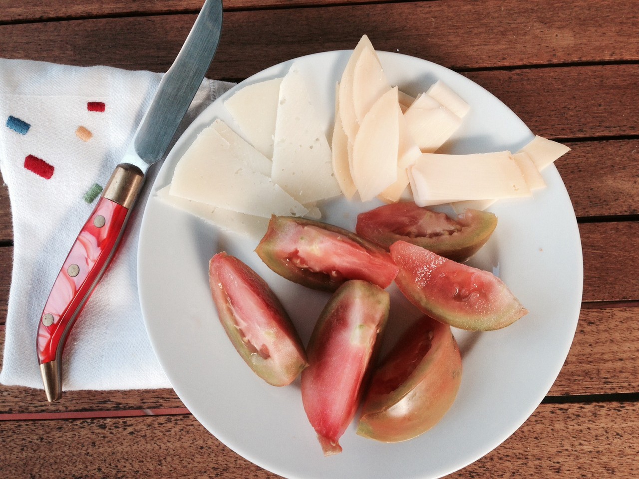 Em casa o jantar era sempre igual, todas as noites: tomate cortado em gomos com tiras de queijo. Nunca me cansei. Hoje, munida de uns bons tomates apanhados na horta da Quinta da Granja, no Bombarral, resolvi reviver esses jantares. Aqui está a foto. Quando o tomate é bom, está na época e é de chão, gosto de o comer sem nada. Nada mesmo, nem sal nem azeite. Hoje juntei-lhe dois queijos, um Gouda ( os holandeses dizem "Rrruda" e um Manchego. À vossa...