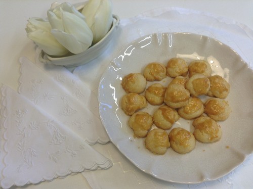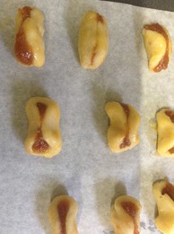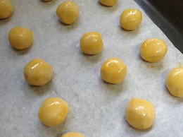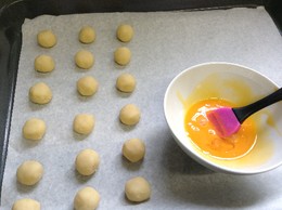 3. Moldam-se bolinhas com cerca de 1 a 2 cm e dispõem-se num tabuleiro forrado com papel vegetal. pincelam-se com a gema e vão ao forno cerca de 15 minutos.