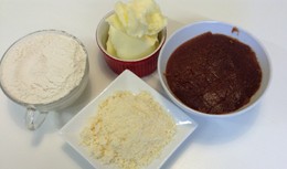 2. Mistura-se a farinha, a manteiga à temperatura ambiente e o queijo ralado com as mãos. Quando começar a despegar das mãos, faz-se uma bola.