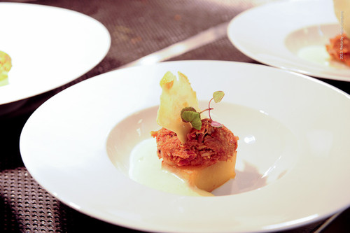 Na entrada, o butelo vinha todo catado de ossos e desfiado sobre três confecções diferentes da magnífica batata transmontana: em lâminas, em espuma e em crocante. A propósito de batata transmontana, quando falamos nela estamos a referir-nos essencialmente a 4 variedades: Desirée, Atlantic, Kennebec e Jaerla, mas isto das variedades merece um post e bem grande.