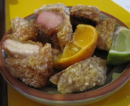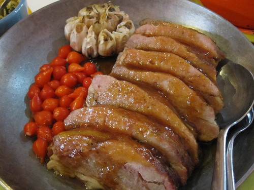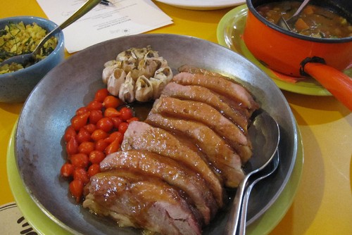 Main dish results of a bull’s eye combination. The star is the Costelinha de Porco (pork cutlet), marvellous in textures after spending 12 hours in the oven, in very low gear, in the company of lots of garlic, much softer than ours in taste, and the typical peppers.