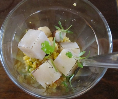The first appetizer, Saladinha de Pirarucu com Cuscuz, is a fish salad made from pirarucu, a big amazonian white fleshed fish and good texture. The flesh was cubed and sealed, than combined with a refreshing cornflour couscous, rich in herbs, namely the electrifying jambu, the tingling herb, and Brazil nuts. Couscous was brought to Brasil from North Africa by the Portuguese, being tham adapted to the regions and the local cereals (in the Northeast of Brazil that cereal is the corn).