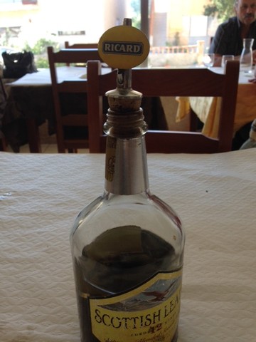 Para a sossega, continua a beber-se bem ao almoço. Por exemplo, este licor de café caseiro, verdadeira armadilha anti ASAE, baralhada pelo rótulo de uísque e a rolha de Ricard.