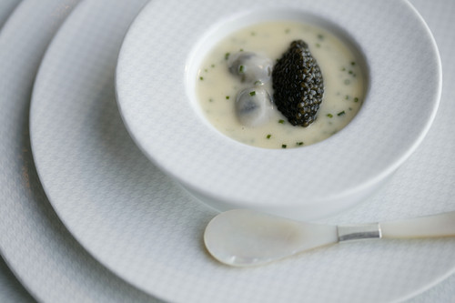 «Ostras e pérolas», o prato emblemático originário do French Laundry e presente em todos os menus de degustação, é uma espécie de mar cremoso, em que umas pequeníssimas ostras se aninham numa cama de cremosas pérolas de tapioca e se escondem sob o caviar osetra. Ali está a Ideia platónica de ostra, a sua essência: sabor a mar ao mesmo tempo que a boca se deleita em cremosidade.