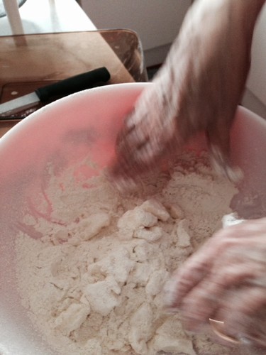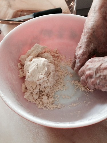 Empurre a massa contra a bancada (três vezes) de modo a que todos os elementos se misturem, mas sem que a massa fique elástica (os franceses chamam-lhe “fraiser la pâte”).